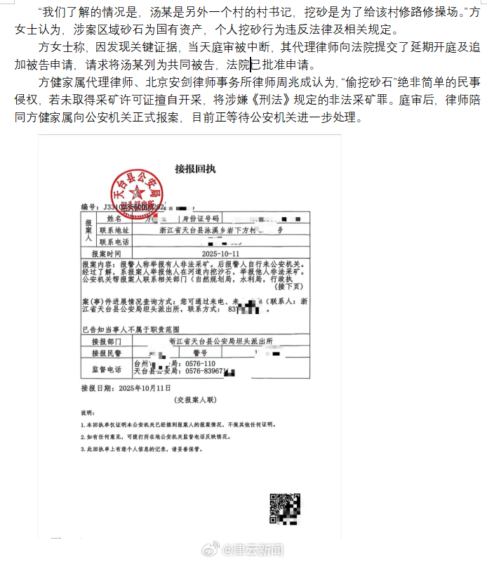 方健家属代理律师、北京安剑律师事务所律师周兆成@周兆成律师 认为,“偷挖砂石”绝非简单的民事侵权,若未取得采矿许可证擅自开采,将涉嫌《刑法》规定的非法采矿罪庭审后,律师陪同方健家属向公安机关正式报案,目前正等待公安机关进一步处理。
