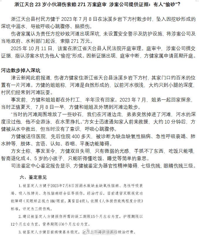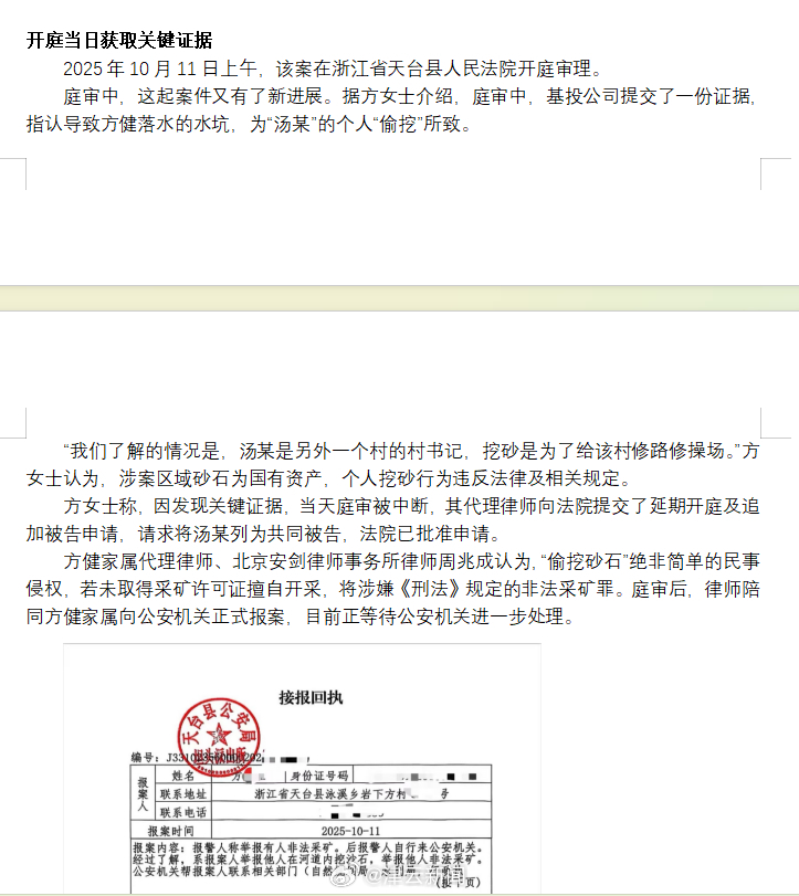 2025年10月11日,该案在浙江省天台县人民法院开庭审理。庭审中,涉案公司提交证据,指认涉案水坑为他人“偷挖”形成。因新证据出现,庭审中断,方健家属申请延期开庭。