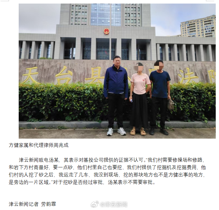 津云新闻致电汤某,其表示对基投公司提供的证据不认可。“我们村需要修操场和修路,和岩下方村商量好,要一点砂,他们村里自己也要挖,我们村提供了挖掘机及挖掘费用,他们村的人挖了砂之后,我运走了几车,我没到现场,挖的那块地方也不是方健出事的地方,是旁边的一片区域。”对于挖砂是否经过审批,汤某表示不需要审批。