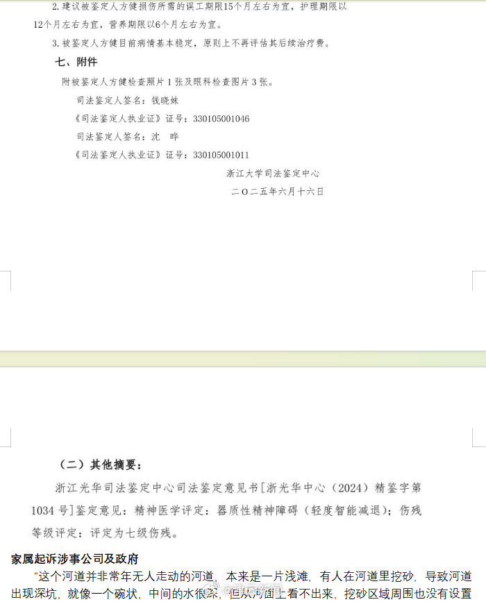 司法鉴定中心鉴定报告显示,方健被鉴定为器官性精神障碍,七级伤残,眼睛伤残三级。