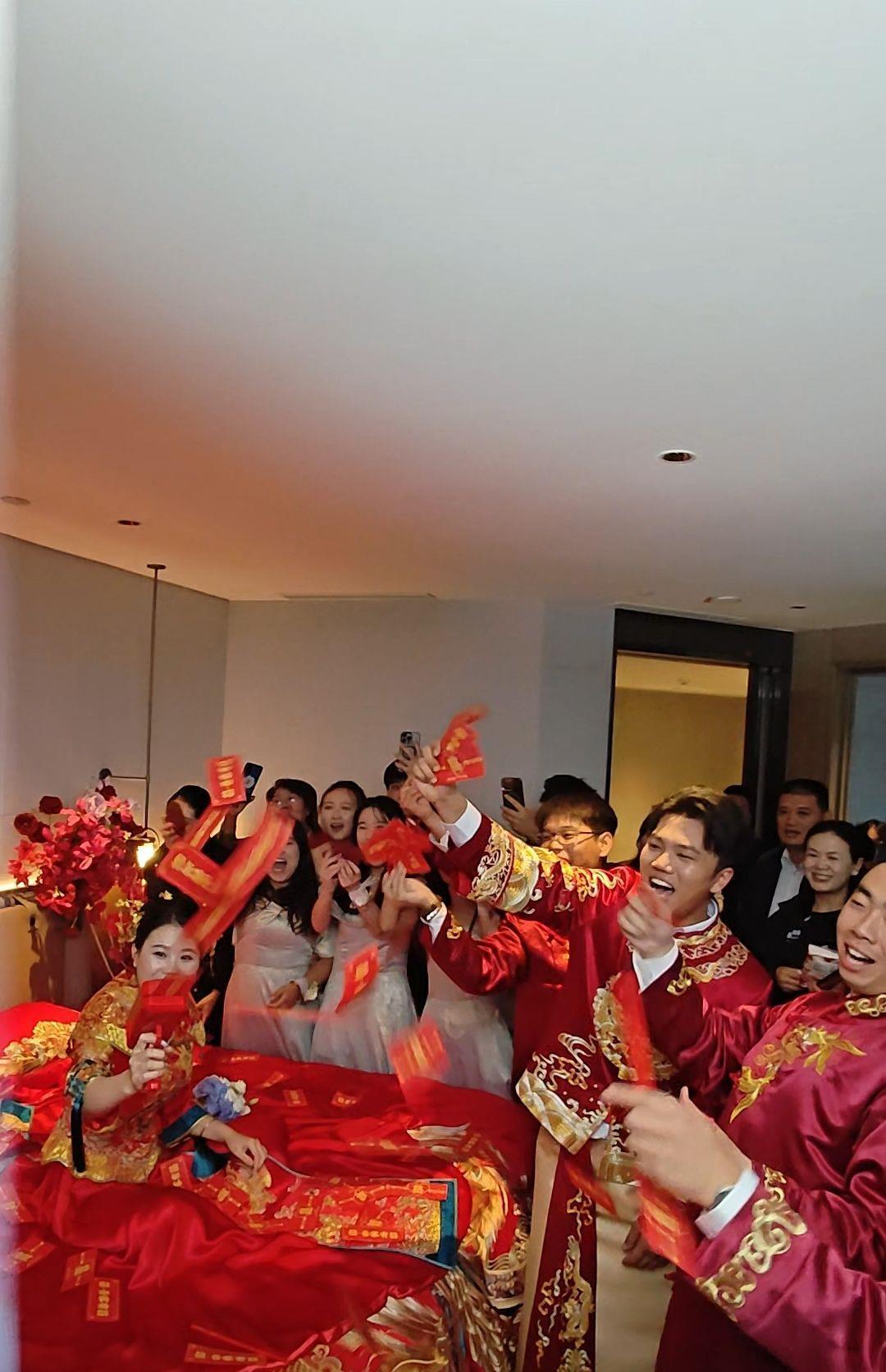 现场一位伴郎告诉极目新闻记者,解清帅的妻子是他大学校友,已经相爱四年,他们在解清帅认亲前就在一起了。早上8点多,解清帅和伴郎、亲友一起来到新娘所在的酒店,在现场,他们唱了歌、还玩了各种接亲游戏。极目新闻记者现场看到,解清帅接亲时未被堵门,高唱《大花轿》后进门,伴娘放礼花筒欢迎解清帅,解清帅30秒完成找新娘五关游戏,表白新娘:“今天要风风光光把你娶回家”。