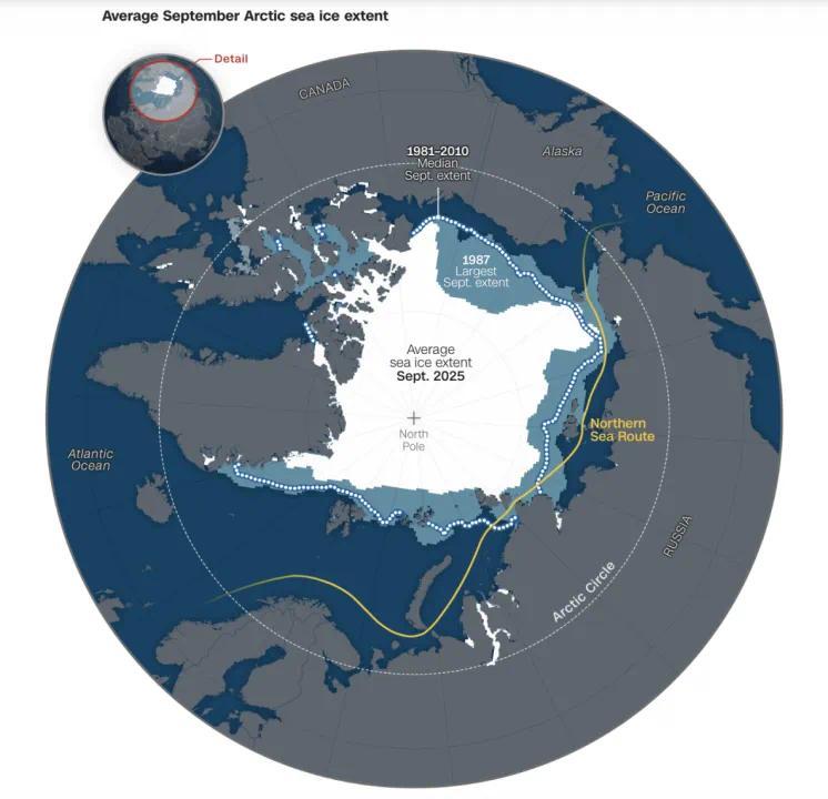 ▎每年九月,海冰缩至年度最小范围——2025年9月10日,海冰覆盖面积创下有记录以来的第十低水平。图中白色区域为2025年的平均海冰覆盖范围,蓝色区域为历史最大海冰覆盖范围(1987年),黄色线条为北极航道。图源:美国有线电视新闻网