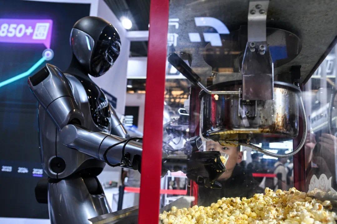 ▎在上海举行的世界人工智能大会上,一个机器人正在端爆米花。图源:法新社