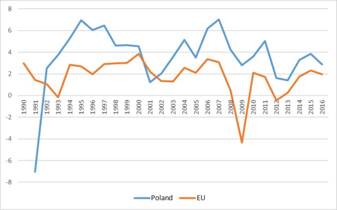 ▎1990至2016年间波兰和欧盟的GDP年均增长率对比图,其中蓝色代表波兰的GDP年均增长率。图源:ResearchGate