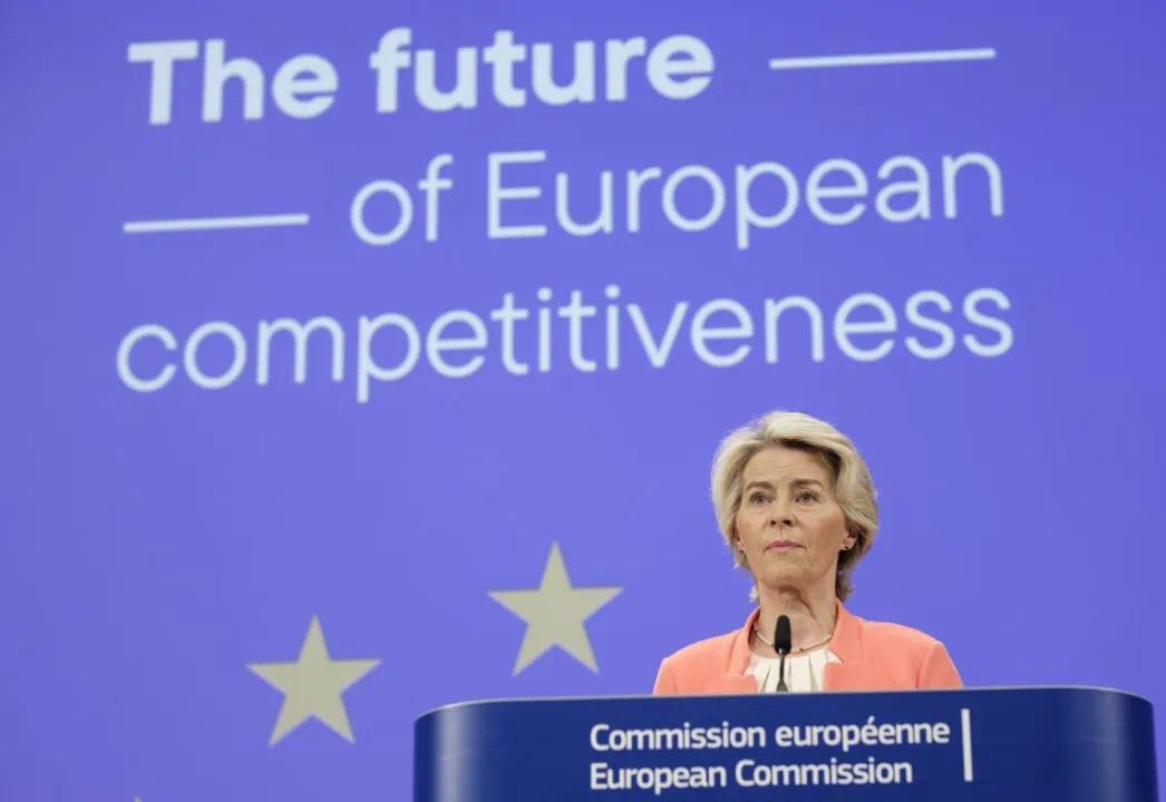 ▎2024年9月9日,欧盟委员会主席冯德莱恩在布鲁塞尔出席会议,讨论名为《欧洲竞争力的未来》的报告,报告称欧盟面临长期经济增长下滑的问题,呼吁采取行动。图源:盖蒂图片社