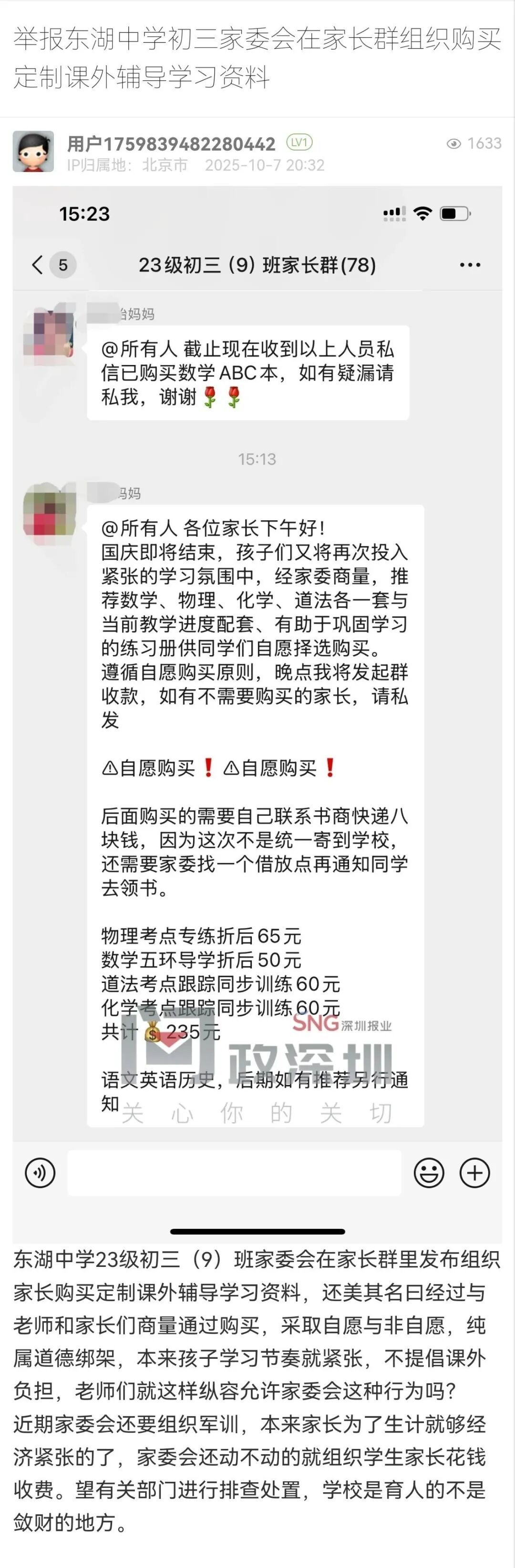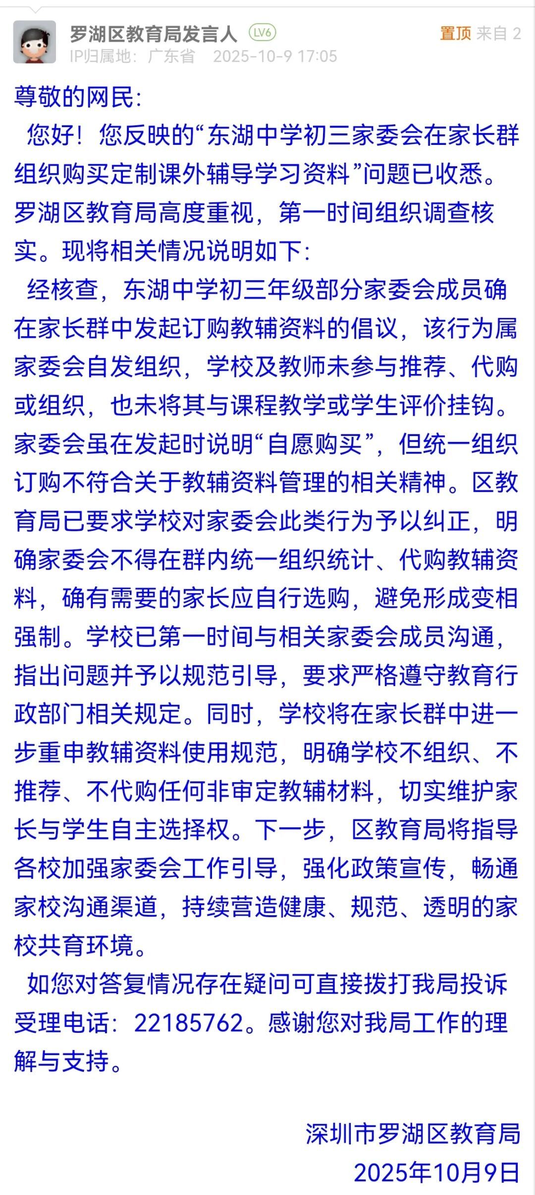 经核查,东湖中学初三年级部分家委会成员确在家长群中发起订购教辅资料的倡议,该行为属家委会自发组织,学校及教师未参与推荐、代购或组织,也未将其与课程教学或学生评价挂钩。家委会虽在发起时说明“自愿购买”,但统一组织订购不符合关于教辅资料管理的相关精神。区教育局已要求学校对家委会此类行为予以纠正,明确家委会不得在群内统一组织统计、代购教辅资料,确有需要的家长应自行选购,避免形成变相强制。
