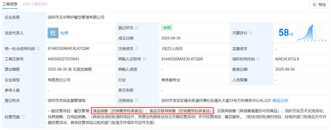 天眼查显示,深圳市玉华美好餐饮管理有限公司(下称玉华餐饮)于9月30日成立,注册资本为100万元人民币。