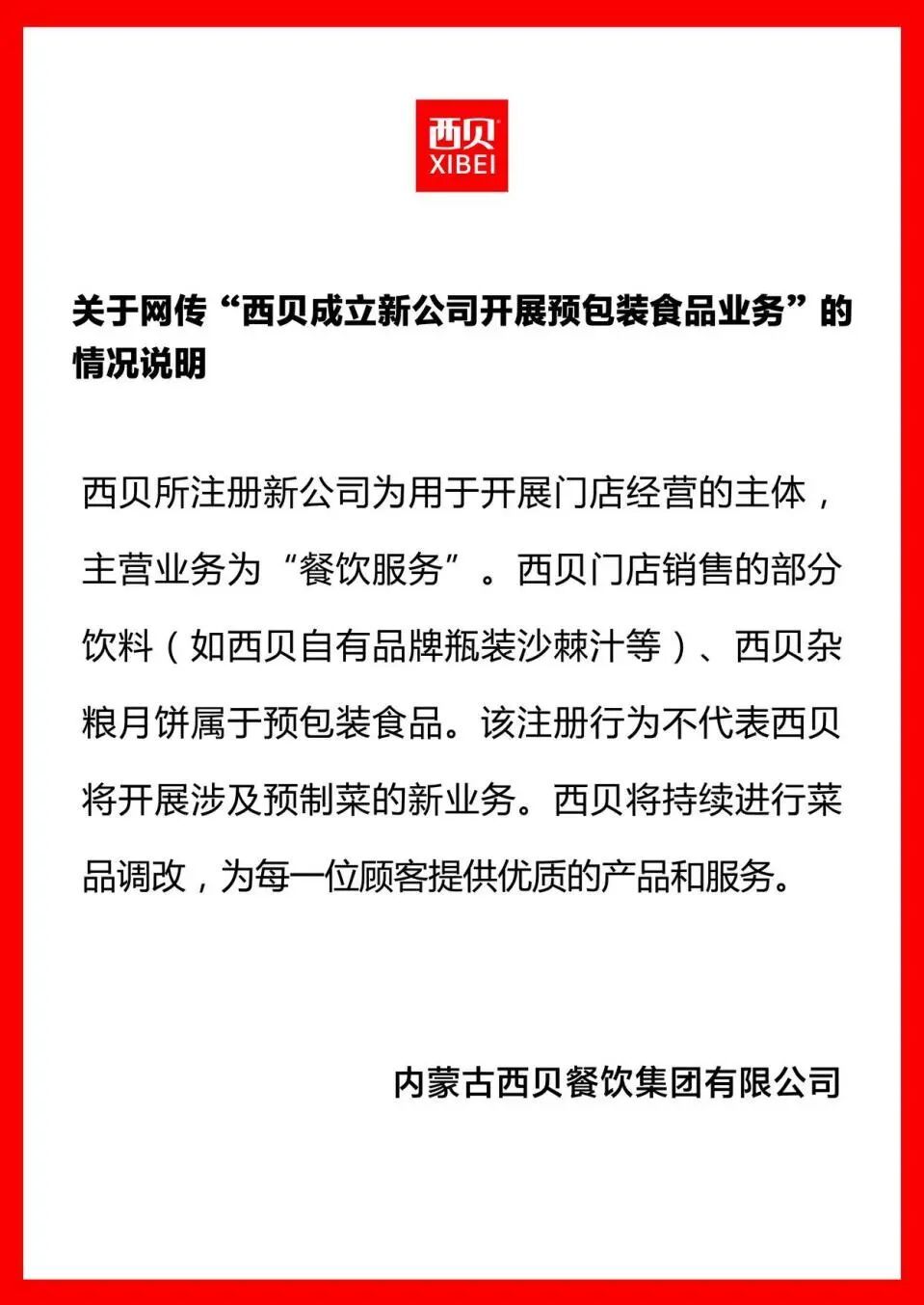 西贝在声明中指出,西贝所注册新公司为用于开展门店经营的主体,主营业务为“餐饮服务”。西贝门店销售的部分饮料(如西贝自有品牌瓶装沙棘汁等)、西贝杂粮月饼属于预包装食品。该注册行为不代表西贝将开展涉及预制菜的新业务。