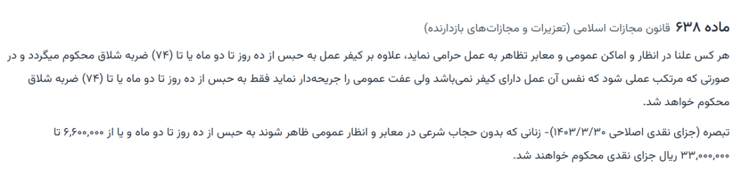 目前,伊朗《伊斯兰刑法典》第五章第638条确立“强制佩戴头巾”法律义务条款仍然有效,尚未有任何政府部门或司法机构宣布法律变更。