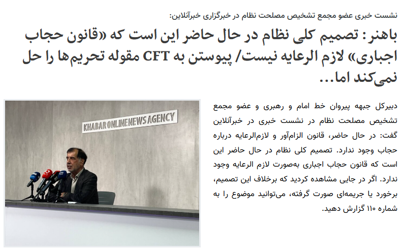 根据伊朗Khabar Online通讯社4日报道,确定国家利益委员会(即网传说法中的“可行性评估委员会”)成员巴霍纳尔当日在该通讯社举办的新闻发布会上,就伊朗是否应加入《反恐融资公约》(CFT)和《头巾与贞洁法》(Hijab and Chastity Bill)的现行状态发表讲话。