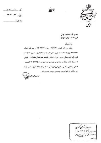 巴霍纳尔所指的《头巾与贞洁法》是伊朗议会于2023年通过、但尚未正式实施的一项新法案。该法案原计划在2024年正式生效,旨在加强对不遵守头巾规定者的处罚机制,包括高额罚款、吊销驾驶证或护照、禁止出境、关闭营业场所、借助监控摄像头识别未佩戴头巾者。