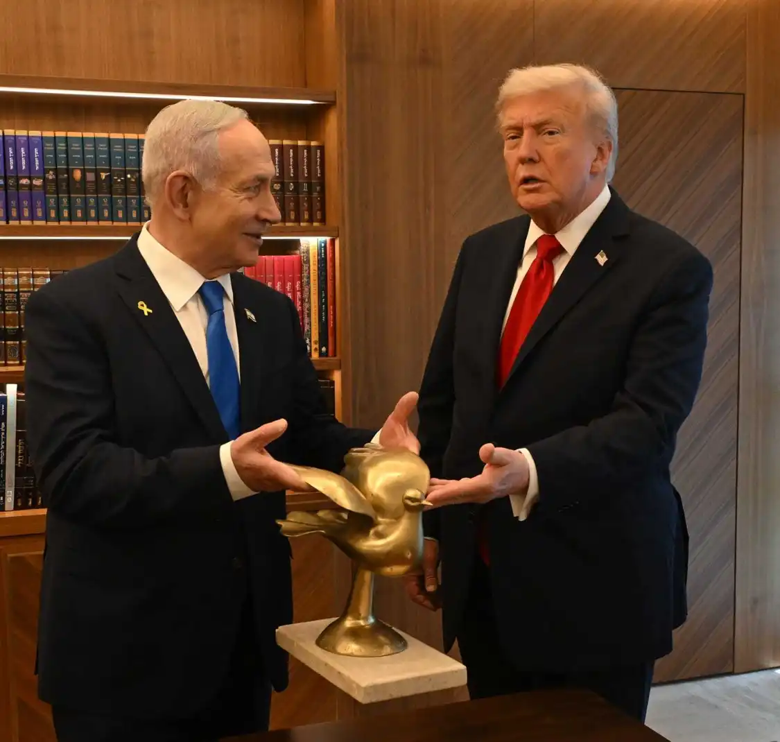 【内塔尼亚胡赠送特朗普一只金色和平鸽】内塔尼亚胡向到访的特朗普赠送了一只金色和平鸽,以感谢他为调解以色列与哈马斯冲突所做的努力。>>详情