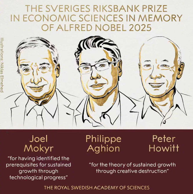 瑞典皇家科学院决定将2025年度瑞典中央银行纪念阿尔弗雷德·诺贝尔经济学奖授予乔尔·莫基尔、菲利普·阿吉翁和彼得·豪伊特,以表彰他们“对创新驱动型经济增长的阐释”。
