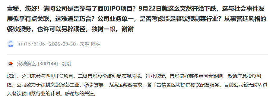 【大河财立方消息】 10月14日,宋城演艺在投资者互动平台上回应是否有参与西贝IPO项目及是否考虑涉足餐饮预制菜行业等问题。