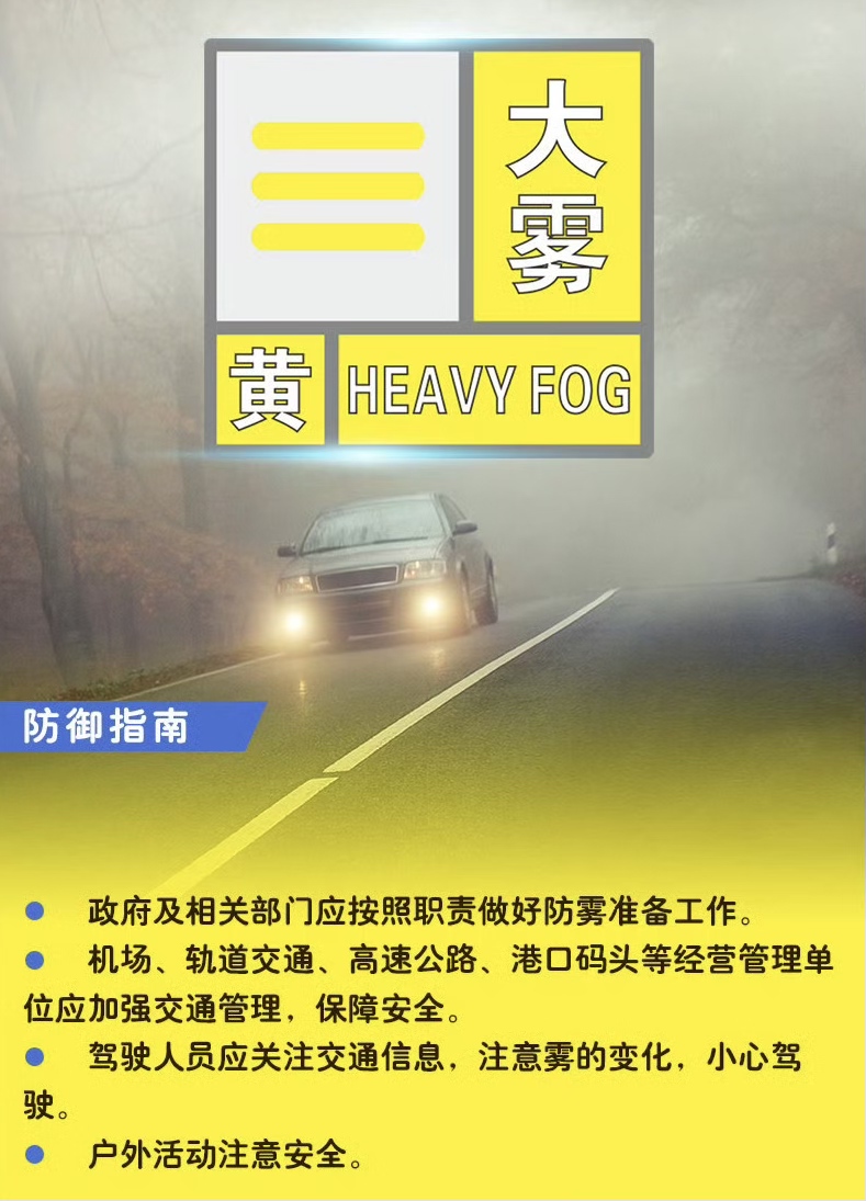 今天凌晨,河南省气象台发布大雾黄色预警:预计14日4时40分至10时,安阳东部、鹤壁、濮阳、焦作东部、新乡、郑州中东部、开封、商丘西部、许昌东部、周口、平顶山南部、南阳东部、驻马店、信阳北部部分县(市、区)将出现能见度低于500米的浓雾,其中安阳东部、濮阳西部、新乡南部、郑州东部、许昌、平顶山南部、周口、南阳东部、驻马店北部部分县(市、区)有能见度低于200米的强浓雾,局部能见度低于50米。