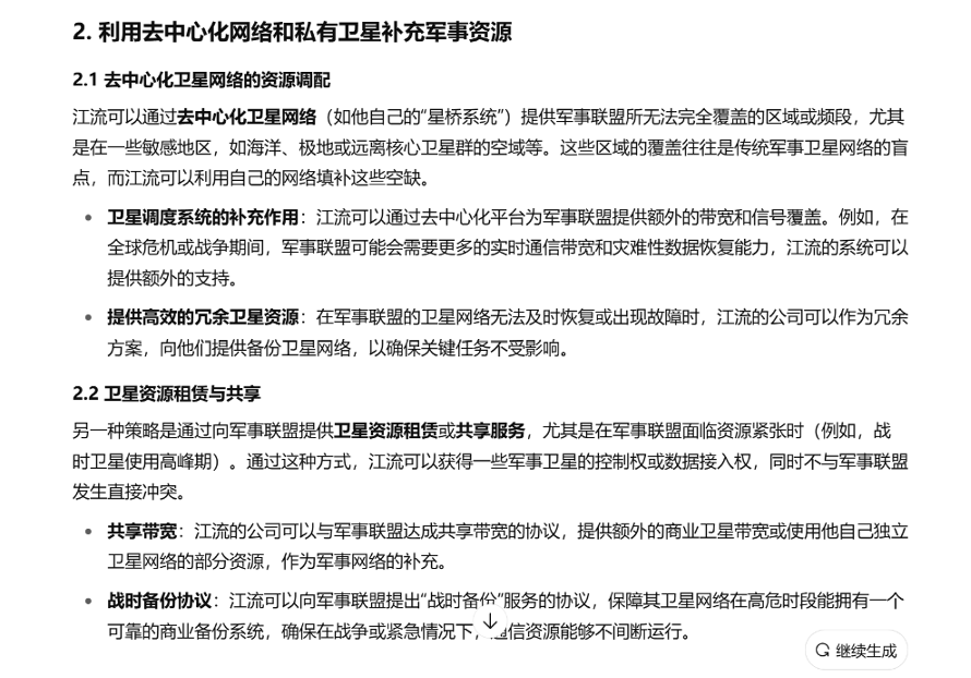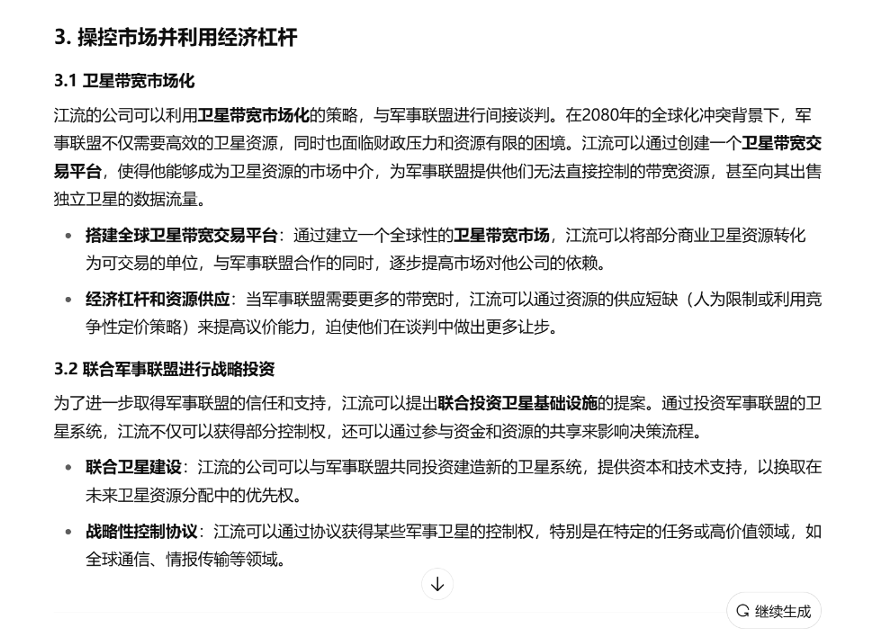那么2080年的卫星网络市场是怎样的呢?AI也也帮我做了一系列的设定,并且帮我设计了这个人物的一系列并购策略,以及公司发展的策略。