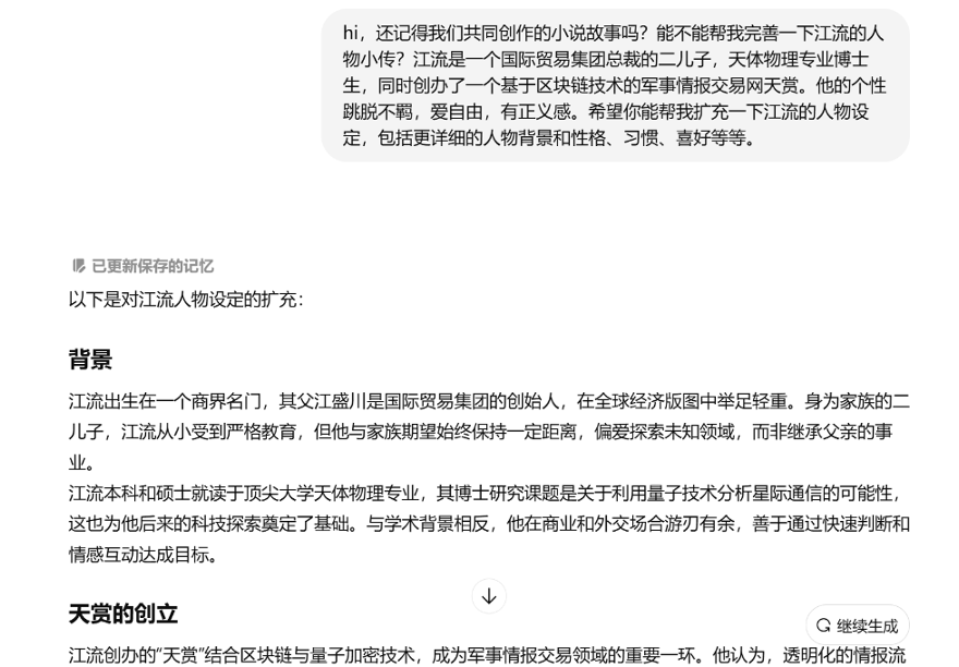 我今年新完成的一部长篇科幻小说《折叠宇宙:吞噬文明》,里面有一个人物叫江流,他是小说中一个重要角色。我会把我对这个人物的一些基础设想告诉人工智能,让它帮我完成人物的详细设定。
