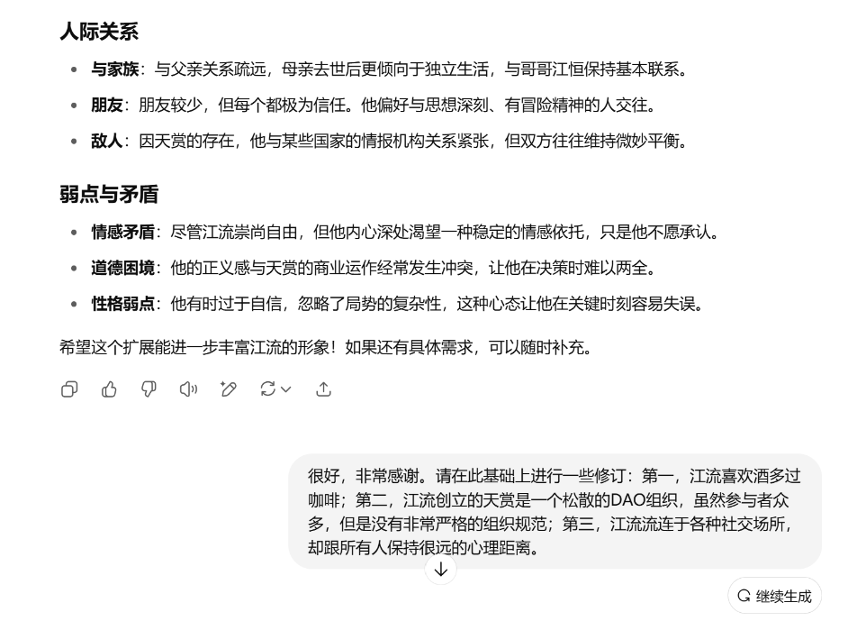 我对人工智能写作的很多人物特点是非常满意的,但里面又会有一些细节跟我头脑中想象的不一样,我会让人工智能再帮我修订。