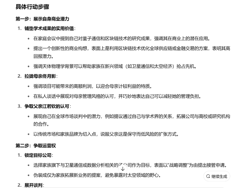 于是AI就帮我设定出这个人物、这个小说角色的一系列行动策略:他如何争夺公司的运营权,如何展示自身的商业潜力,如何拉拢家人的支持争取运营权,如何获得外部资本的支持,如何进行技术整合和秘密推进,如何应对外部的风险。
