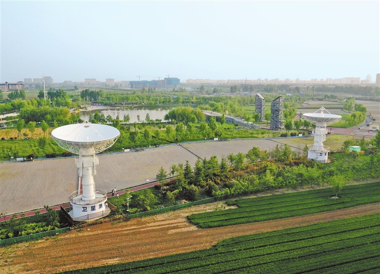 4月20日在鹤壁市卫星智造产业园附近拍摄的卫星地面基站天线(无人机照片)。 新华社发