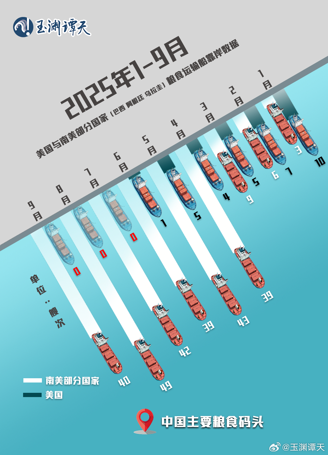谭主独家从中国主要粮食码头获悉:今年1至9月,美国粮食运输船靠岸艘次同比下降56%,从72艘降至32艘,这是因为自7月起,来自美国的粮食运输船在该码头靠岸艘次已降为0。对比来看,5月以来,该码头每月平均有40多艘来自阿根廷、巴西、乌拉圭等南美国家的粮食运输船靠岸。这些粮食运输船90%运输的都是大豆。