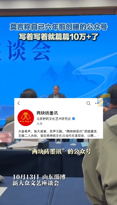 会上,谈到自己的公众号,莫言称自己六年前创建的公众号写着写着就篇篇10万+了。
