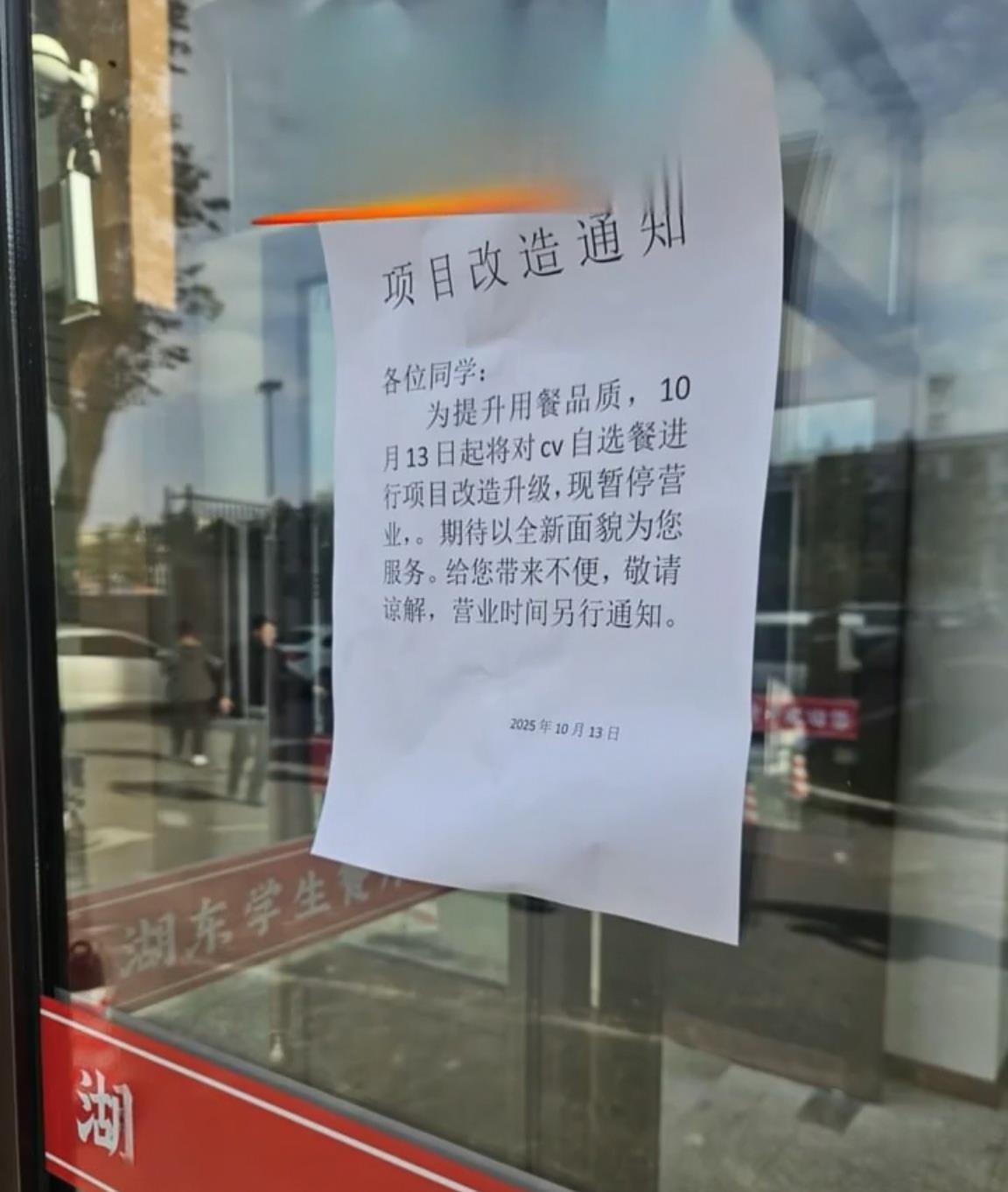 13日,该食堂贴出项目改造通知称:为提升用餐品质,10月13日起,将对CV自选餐进行项目改造升级,现暂停营业。期待以全新面貌为您服务,给您带来不便,敬请谅解,营业时间另行通知。