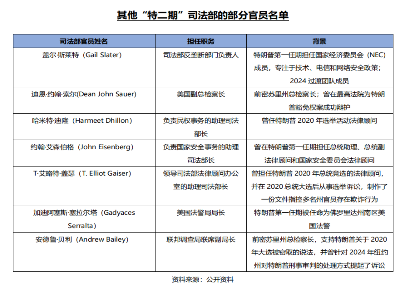 在特朗普的第一任期,他对于先后任命的两任司法部长杰夫·塞申斯和威廉·巴尔的忠诚度均不满意。塞申斯由于不愿参与FBI针对俄罗斯干涉2016年大选的调查而引起特朗普不满,最终应特朗普要求辞职。而其继任者巴尔则在2020年美国大选结束后选择了“反水”,声称没有找到任何证据支持特朗普提出的选举被操控的说法。有此前车之鉴后,特朗普在其第二任期对于司法部官员的忠诚度极为在意,开始大规模安插亲信。