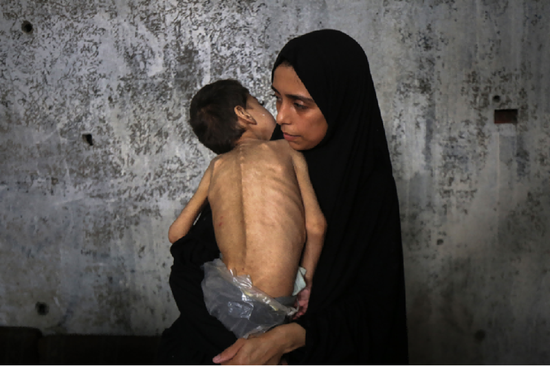 ·当地时间7月25日,在加沙城一处避难所,一名女子怀抱营养不良并患病的儿童。(新华社,里泽克·阿卜杜勒贾瓦德摄)