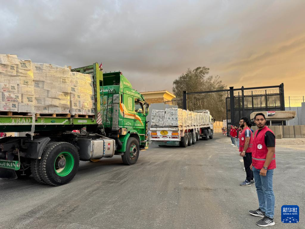 ·当地时间10月12日,载有人道主义援助物资的卡车在埃及红新月会工作人员的监督下从拉法口岸埃及一侧驶向加沙。(新华社,阿里·穆斯塔法摄)