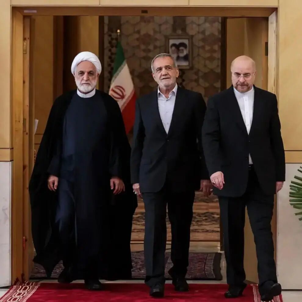 伊朗国防委员会成员包括行政、立法、司法三权领导者,总统佩泽希齐扬(中),司法总监古拉姆侯赛因·埃杰伊(左),议会议长卡利巴夫(右)。(图源:BBC)