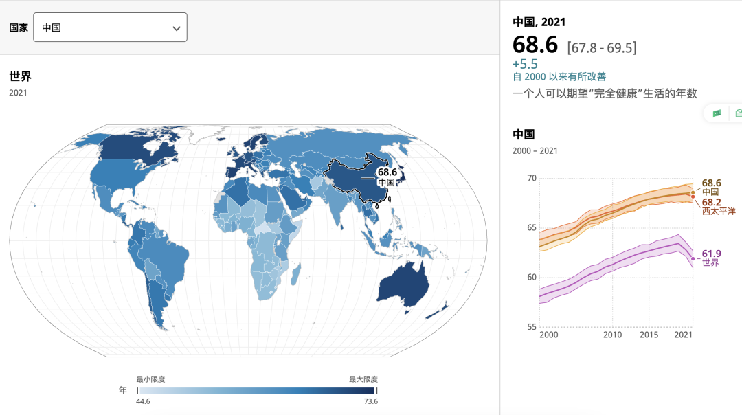 例如根据 WHO 数据,中国人在 2021 年的健康期望寿命是 68.6 岁。也就是说,平均而言,我们有 68.6 年可以在无严重疾病或失能的状态下生活。