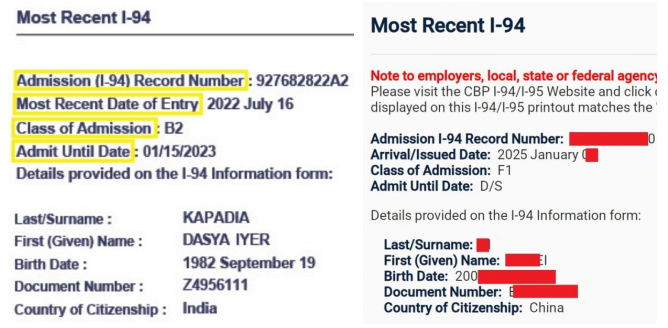 一名印度B2旅游/商务访客(左)和笔者作为F1学生(右)入境美国时的I-94表格样本。可以注意到,“入境许可的过期时间”(Adimit Until Date)处,印度游客是一个具体日期,而笔者是“D/S”即Duration of Status