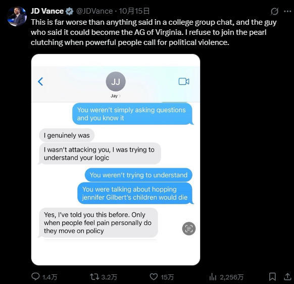 当地时间14日,群聊刚刚曝光后,万斯玩了一招祸水东引。他在社交媒体X平台发布了一张2022年民主党人希望共和党人“头部中两枪”的截图。他写道:“这可比大学群聊里说的任何话都糟糕得多,说这话的人可能会成为弗吉尼亚州的司法部长。”