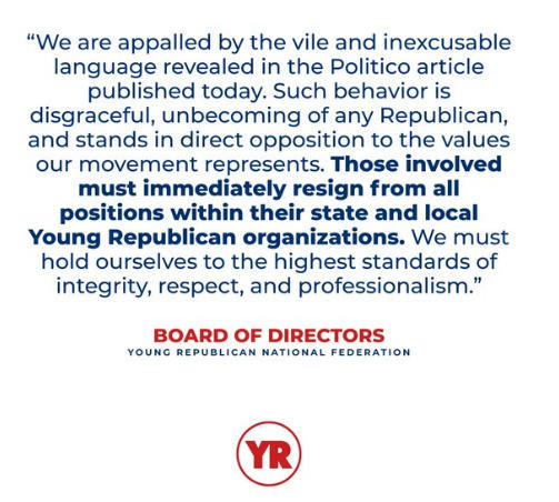 青年共和党全国联合会主席海登·帕吉特则发表声明指出,该组织“谴责一切形式的种族主义、反犹太主义和仇恨”。声明强调:“我要明确指出,这种行为完全不符合我们的价值观,在我们的组织或更广泛的保守运动中都不应存在。”