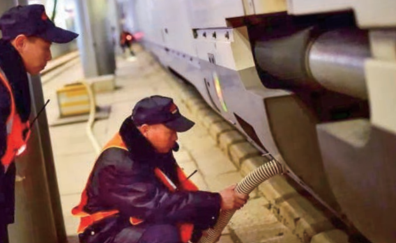 当列车到达站点或终点站后,工作人员会用地面专用的吸污车通过连接管,将集便箱中的污物全部抽走,然后送往专业的污水处理厂进行处理。