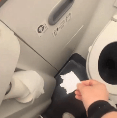 而且,这个吸力看起来还不小。有博主把一小片卫生纸扔在高铁马桶旁边的地上,然后按下“冲水键”,结果旁边地上的这小片卫生纸也被气流“吸”着飞起来,最后进到马桶里。