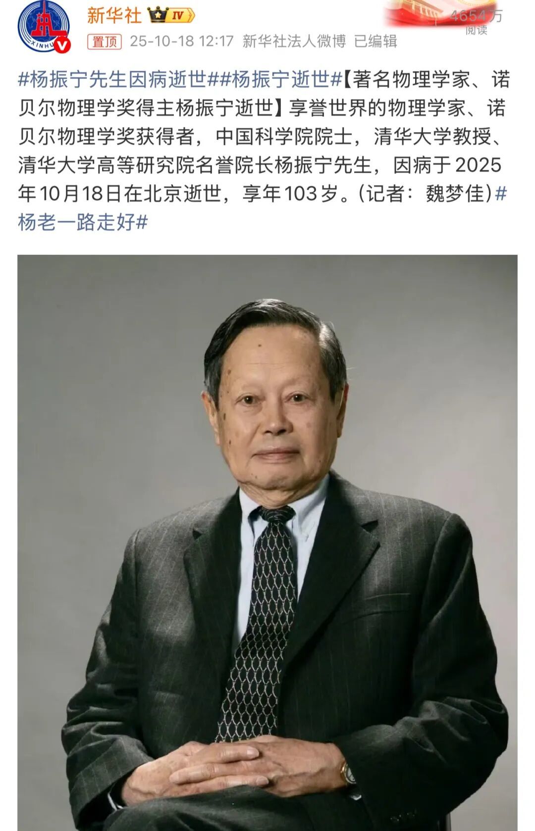 今天最让网友震惊的消息:10月18日,著名物理学家、诺贝尔奖获得者杨振宁因病在北京逝世。