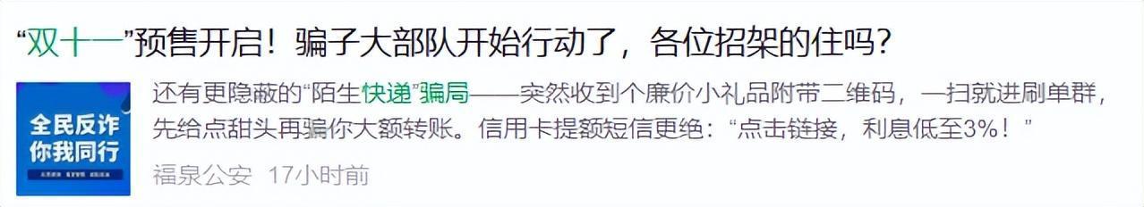 双十一期间快递多,大家容易混淆信息,正好给了骗子可乘之机。建议大家及时下载 “国家反诈中心” APP,了解最新骗局;遇到可疑情况,第一时间拨打 96110反诈专线咨询,别让血汗钱成了骗子的 “双十一红包”!