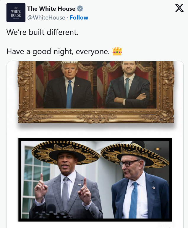 特朗普的团队成员对特朗普开飞机撒屎的AI视频也是有样学样,万斯也发了一段AI制作的视频,表达了他对反对者的轻蔑,内容是特朗普头戴王冠挥剑,佩洛西和其他民主党人跪在戴着王冠的特朗普面前。白宫的官方账号发了一张特朗普与万斯头戴王冠的合影,另一张图是民主党舒默和杰弗里斯头戴墨西哥帽的,配文称“我们生来就与众不同”。