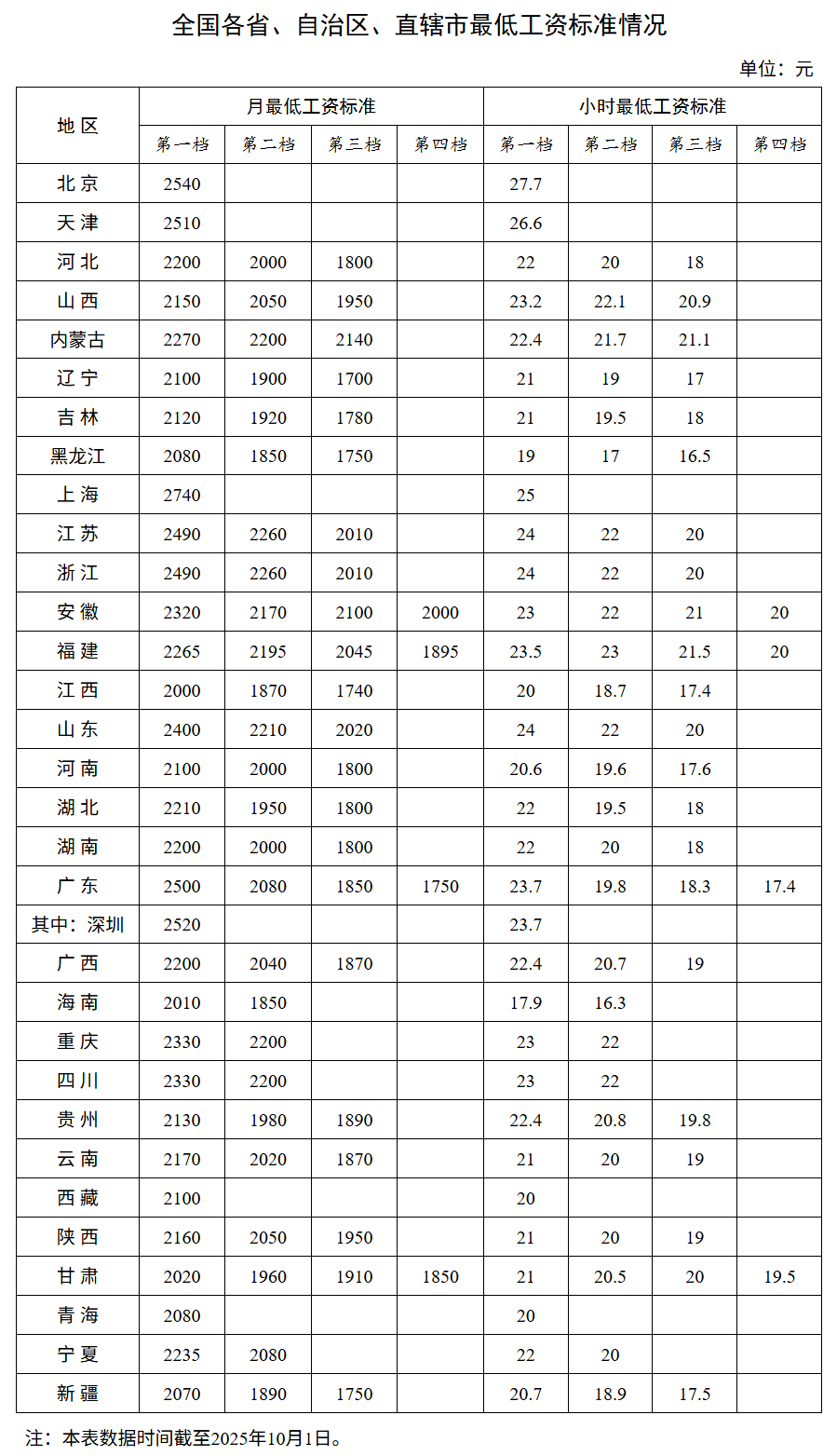 【大河财立方消息】 10月19日消息,人力资源和社会保障部近日公布全国各省、自治区、直辖市最低工资标准情况(截至2025年10月1日)。