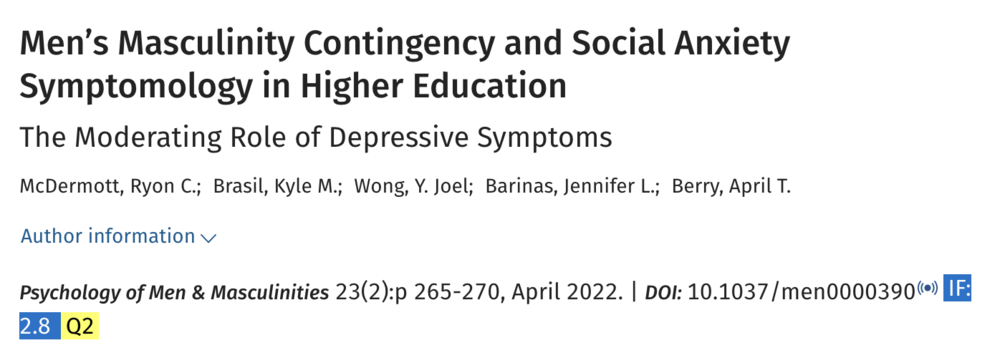 2022年以美国大学男生为样本的《高等教育中男性男子气概依赖性与社交焦虑症状研究》也指出,不男人没价值的观念与社交焦虑、抑郁症呈正相关。