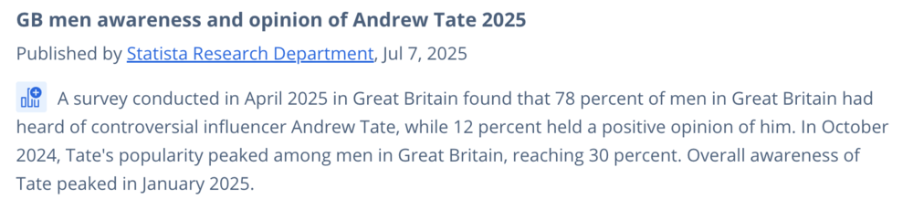 2025年Statista针对安德鲁·泰特的一项调查显示,78%的男性听说过他,但仅有12%的男性对他持正面评价,这一比例较2024年下降了18%。