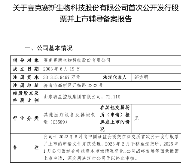 这并非赛克赛斯第一次筹划上市。2022年6月,赛克赛斯向证监会提交在深交所首次公开发行股票并上市的申请文件并获受理,2023年2月平移至深交所,2025年1月赛克赛斯因综合考虑资本市场情况变化、公司战略发展等因素撤回上市申请,深交所决定对公司予以终止审核。