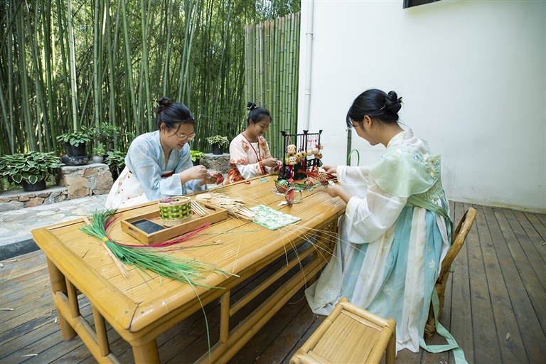 重渡沟竹隐山房民宿内,游客正在体验竹编。