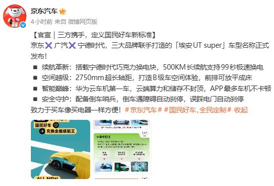 【大河财立方消息】 10月23日,京东联合广汽集团、宁德时代推出“国民好车”的名称对外公布。该款汽车名称为“埃安UT super”,搭载宁德时代巧克力换电块,500KM长续航支持99秒极速换电,同时搭载有华为云车机。