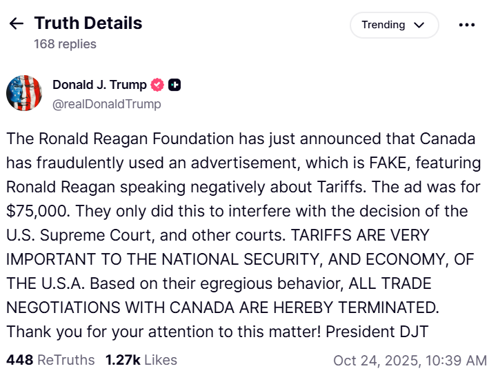 美国总统特朗普10月23日晚突然在社交媒体“真相社交”上发文说:“里根基金会刚刚宣布,加拿大欺诈性地使用了一则虚假广告,其中里根对关税发表了负面言论。这则广告花费了7.5万美元。他们这样做只是为了干扰美国最高法院和其他法院的裁决。关税对美国的国家安全和经济至关重要。鉴于他们恶劣的行为,我们特此终止与加拿大的所有贸易谈判。”