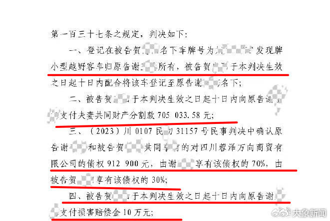 近日,备受关注的“女子两年遭多次家暴”当事人小谢收到成都市武侯区人民法院送来的财产分割判决书。