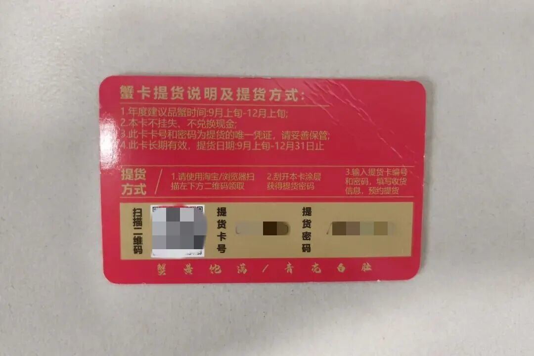 在这吃蟹的季节,许多人莫名其妙收到了一张邮寄来的蟹卡,蟹卡印刷精美,背后印有二维码,卡上宣称可以凭借这张蟹卡“提货”。