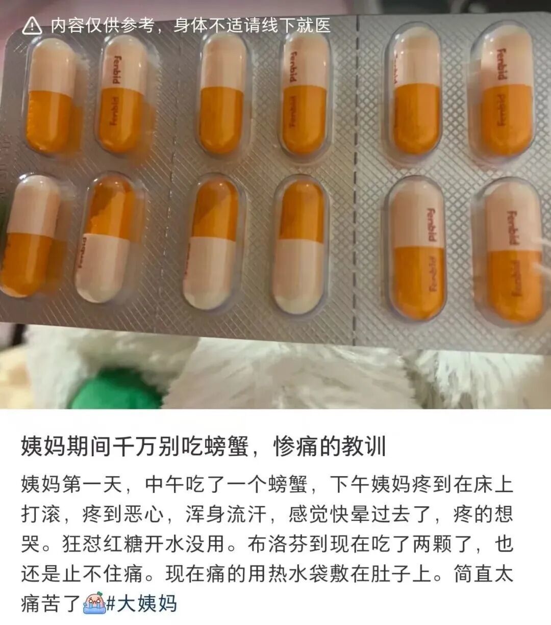 有网友表示:“本来痛经都快被治好了,大姨妈前吃了俩螃蟹,再次体会到被一拳打肚子的痛。”